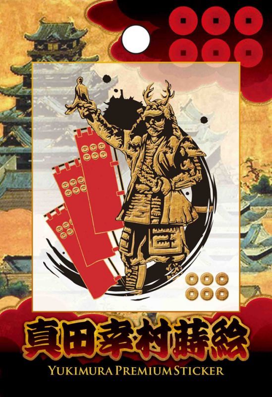 戦国を生きた武将、真田幸村が蒔絵シールになって登場! 銅像と旗、家紋「六文銭」をデザインしました。