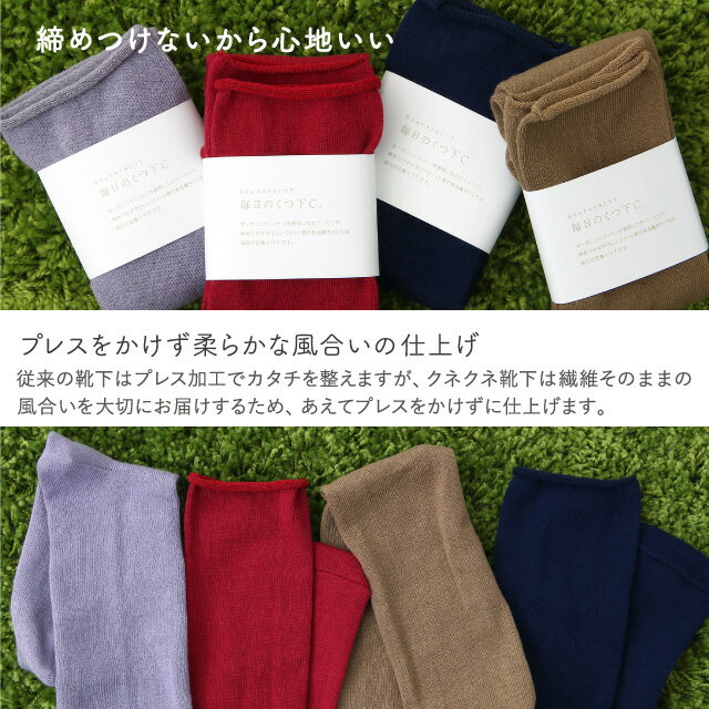 オーガニックコットンを使用したカラーくつ下「毎日のくつ下C.」 プレスをかけずに仕上げているため足首への締め付けがありません オーガニックコットンの柔らかくやさしい肌触りと、締めつけずやさしいフィット感のある履き心地が魅力の毎日履きたくなる「毎日のくつ下C.」 プレスをかけずに編みあげているため履くほどに柔らかく馴染み、足への締め付けがありません。